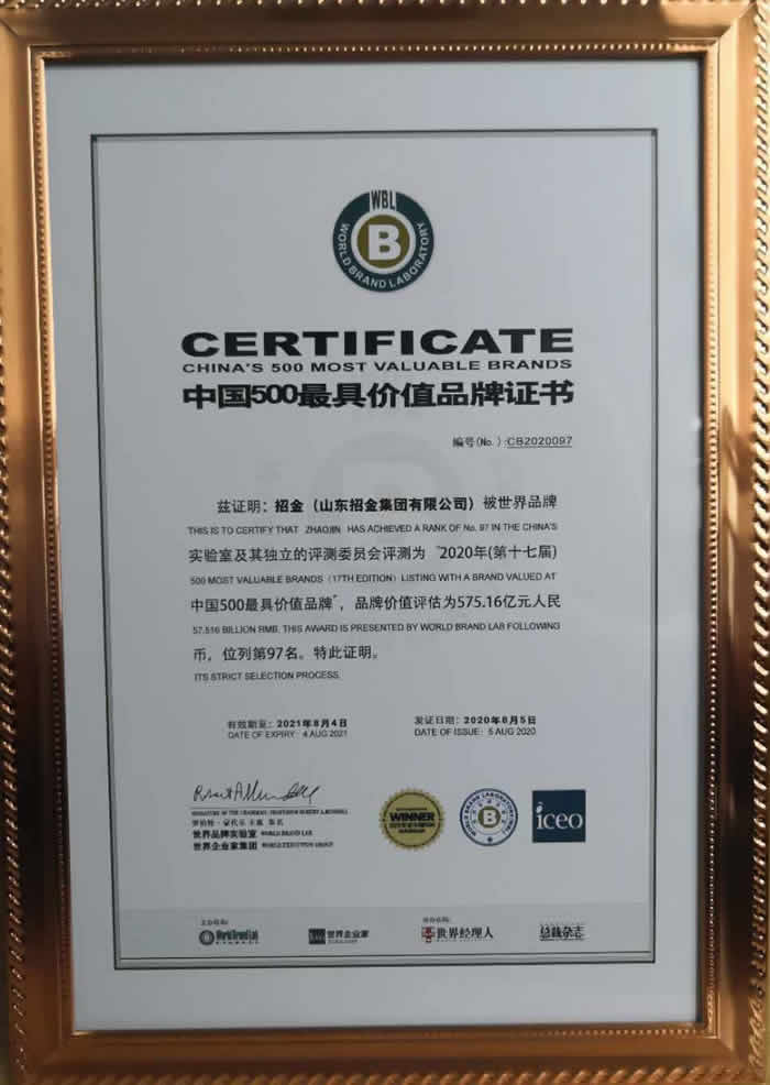8月5日,由世界品牌實(shí)驗(yàn)室(World Brand Lab)主辦的(第十七屆)“世界品牌大會(huì)”在北京舉行,會(huì)上發(fā)布了2020年《中國(guó)500最具價(jià)值品牌》分析報(bào)告。在這份基于財(cái)務(wù)數(shù)據(jù)、品牌強(qiáng)度和消費(fèi)者行為分析的年度報(bào)告中,招金品牌以575.16億元位居榜單第97位,較2019年提升2位,位居山東省第七位,煙臺(tái)市第一位,這也是招金連續(xù)17年榮登該榜單。