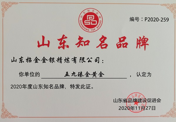 近日,由山東省品牌促進協(xié)會主辦的“品牌聚力 智匯未來”2020年山東省品牌年會近日在濟南山東大廈如期召開。山東招金金銀精煉有限公司“五九臻金黃金”并被授予“2020年度山東省知名品牌”稱號。